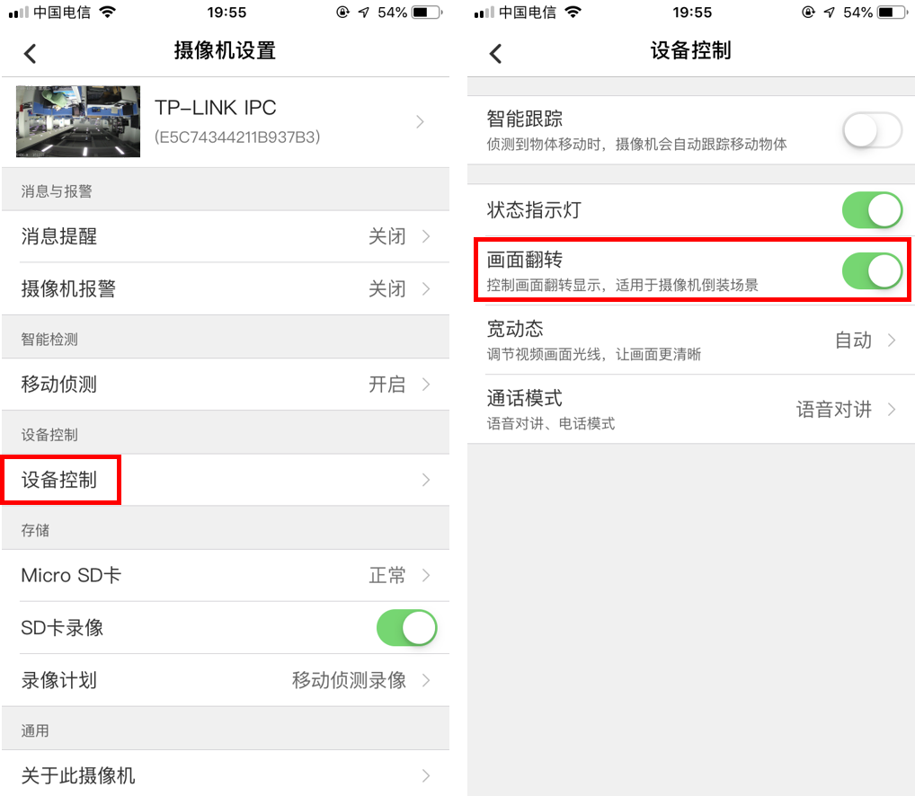 如果摄像机被APP直接管理,可以在APP上找到【摄像头设置>设备控制>画面翻转】,点击开启后就可以将画面倒置。