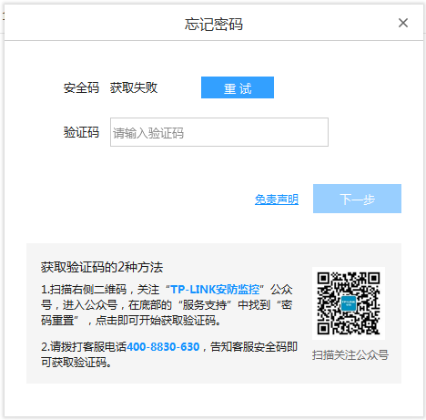 关注 “TP-LINK安防服务” 微信公众号,点击界面下方菜单“服务支持->密码重置”,注册成功后使用安全码获取临时密码。