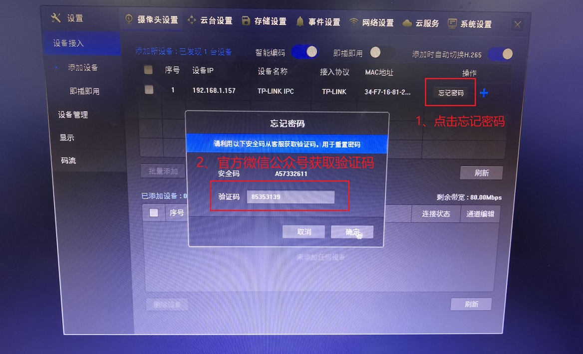 搜索出未添加且需要重置密码的摄像机后,点击“忘记密码”。点击“忘记密码”后可参照上文的“方法三->情况2->获取临时密码”填写“验证码”,点击确定,如下图: