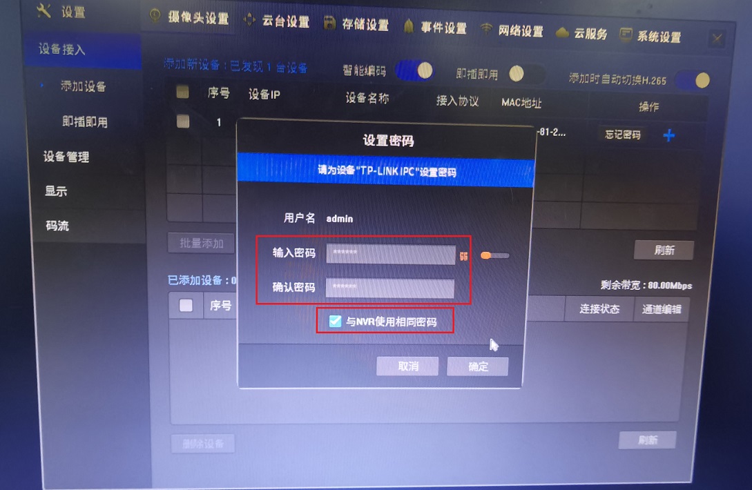 可以选择使用录像机密码作为摄像机的新密码,也可以手动输入密码并点击确认,完成密码的重置,如下图: