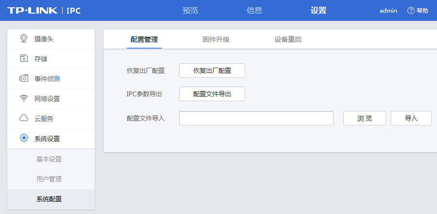 如果IPC没有设置登录密码或者知道IPC的登录密码时,可以登录IPC的WEB界面,在【设置>系统设置>系统配置>配置管理】,点击【恢复出厂配置】即可。