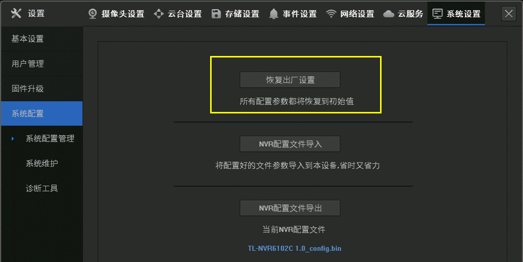 以GUI界面操作为例,将NVR上电并连接显示屏和鼠标,输入用户名密码登录GUI界面,在【设置>系统配置>系统配置管理】,点击【恢复出厂设置】即可。