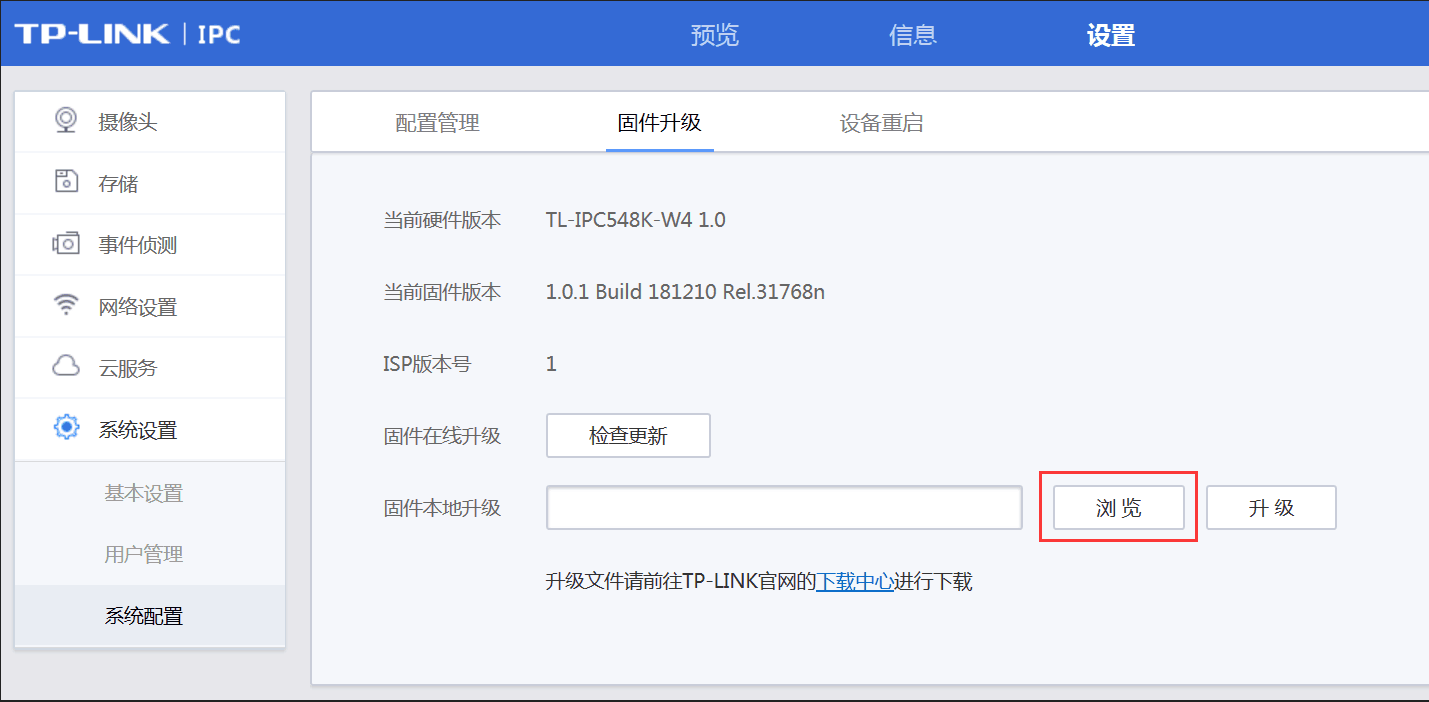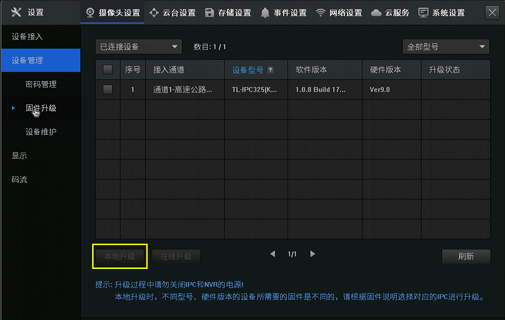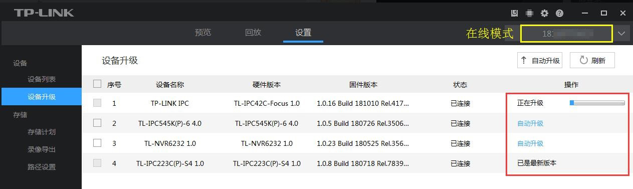 通过录像机升级:使用TP-LINK录像机可以设置摄像头本地升级或在线升级。