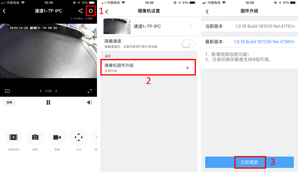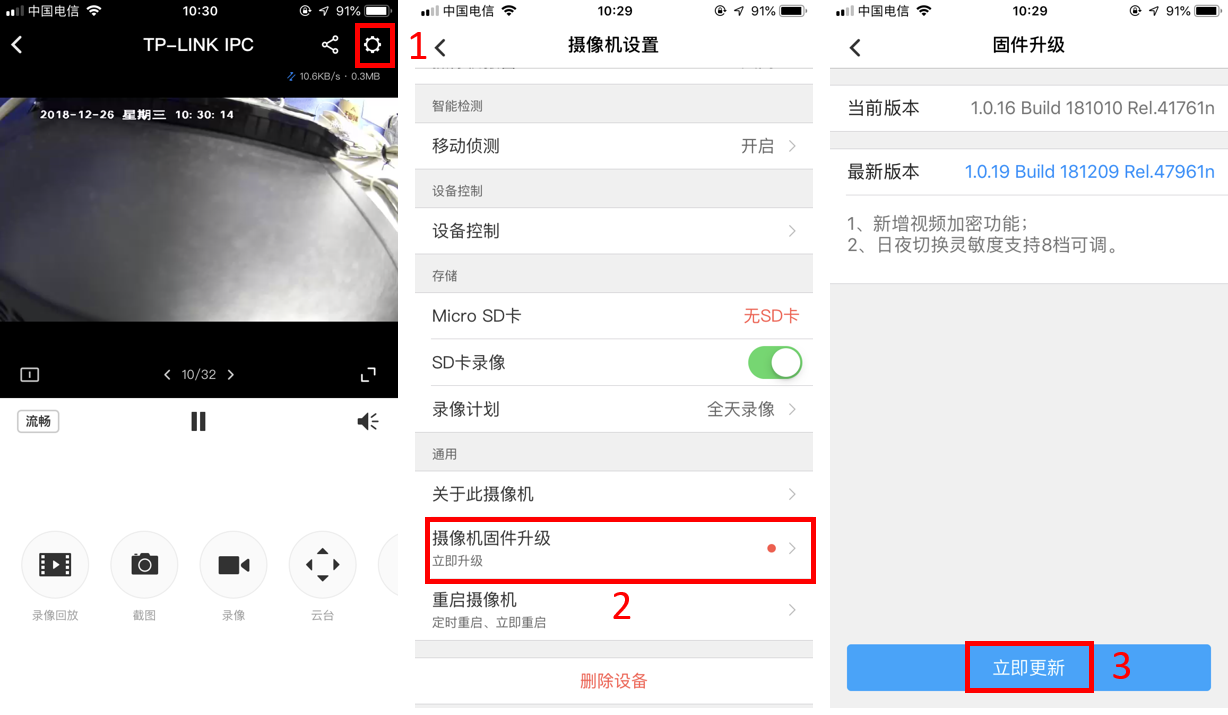 手机APP升级:通过TP-LINK安防APP进行在线升级,可远程操作。