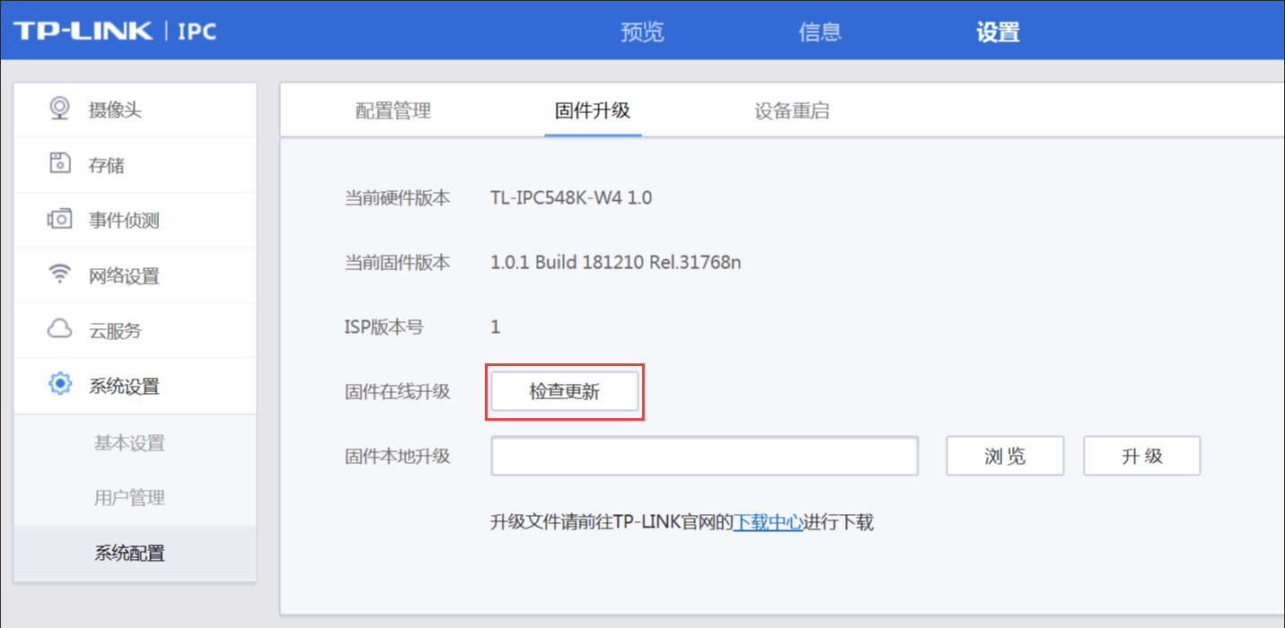 可以将IPC单独添加到TP-LINK ID上,然后在【摄像机设置>摄像机固件升级】中进行在线检测和更新。