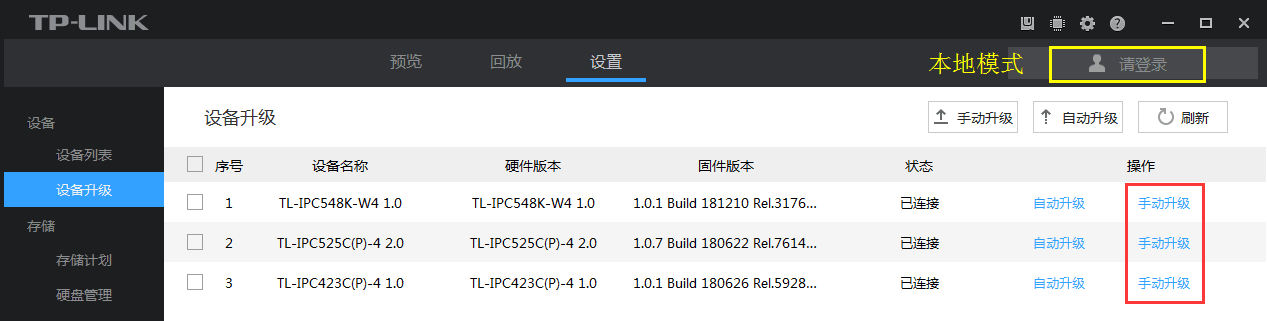 在本地模式下添加IPC后,在【设置>设备升级】的界面选中需要升级的设备,然后选择自动升级,摄像机就会自动检测是否需要更新。