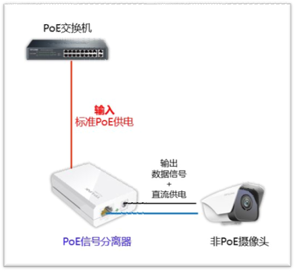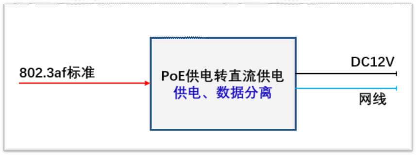 非 PoE 摄像机一般采用 DC 12V 供电,如果需要使用标准 PoE 供电,就需要将标准 PoE 线路传输的供电和数据信号分离为 DC 供电和网络接口,提供非 PoE 摄像机接入。如下: