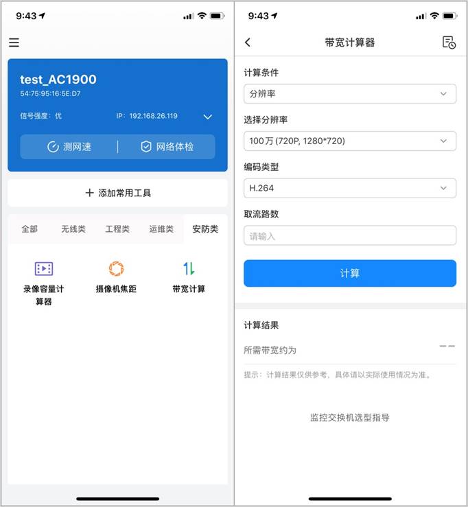 答案当然是有。这里推荐大家一款非常实用的工具APP——网络百宝箱,这款APP支持无线类、工程类、运维类、安防类等各种实用的功能,其中带宽计算器就可以帮助你快速计算各分支的带宽占用情况,帮助你选择合适的交换机。