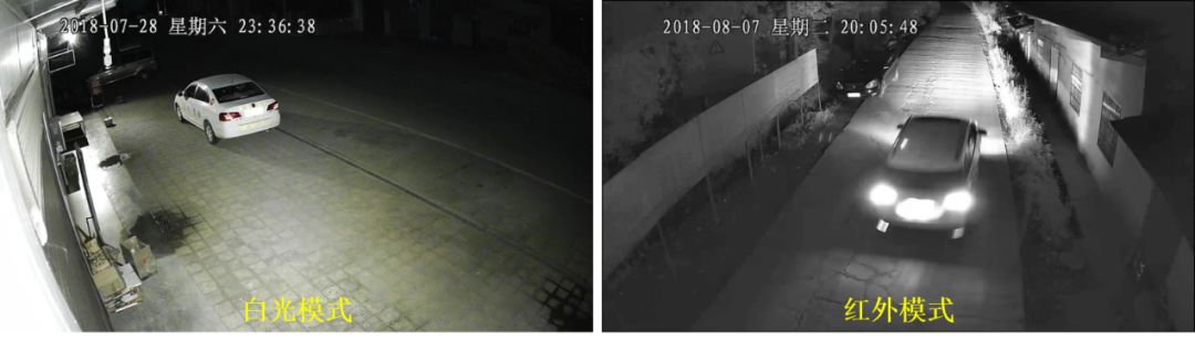 例如下面这个场景中,按照上面的设置方法,当没有车辆通过移动侦测区域时,使用红外夜视模式监控,可以看清环境;当检测到车辆通过时,自动开启白光,启动“车牌模式”,可以看清车牌。