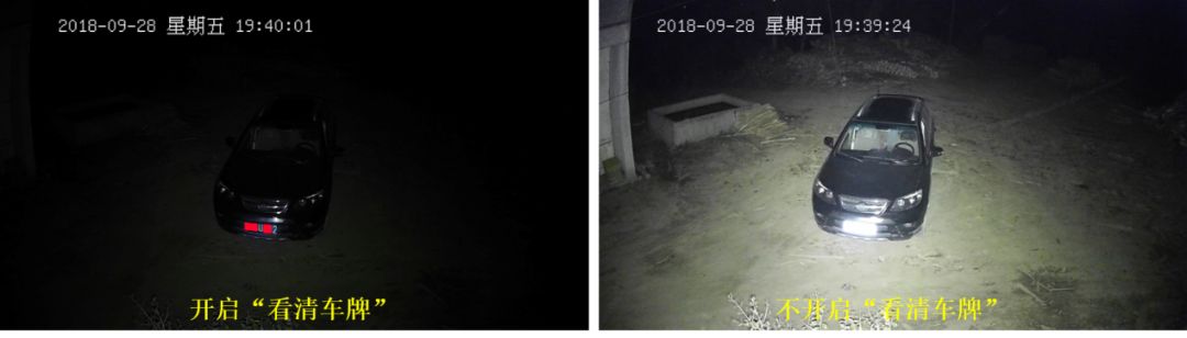 简单来说,开启补光灯后,由于车牌将接收到的大部分光反射给了摄像头,所以正常情况下监控车牌很有可能是一片白。而“看清车牌”功能,就是通过降低摄像头的曝光时间,让镜头接收到的车牌反射光少一些,从而解决车牌过曝的问题,这样就可以清楚的看清车牌,相应的,周围的场景就会比较暗。