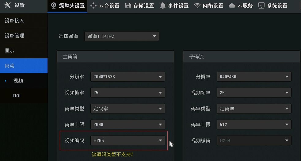 我们可以在【设置>摄像头设置>码流】界面将摄像头的主码流编码修改回H.264,如:
