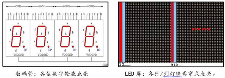 LED画面点亮方式基本都是动态扫描,即不能瞬间将需要显示的内容全部点亮,存在一个扫描周期的概念。