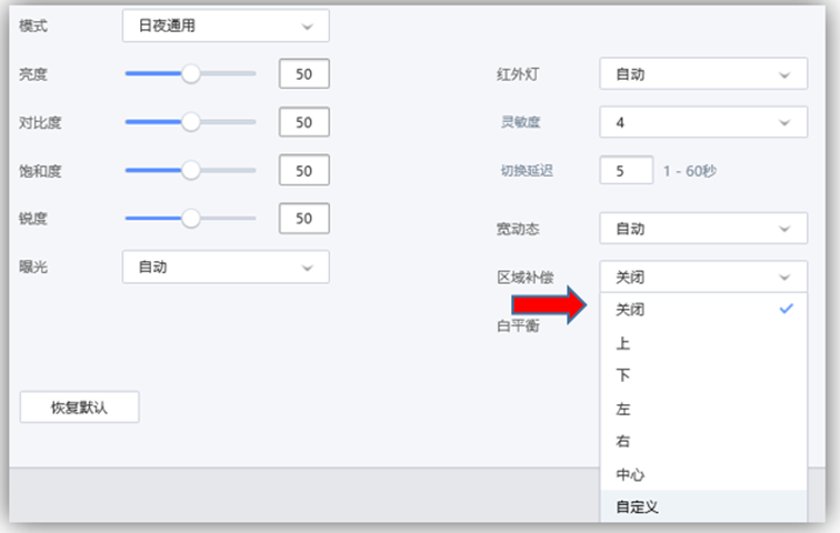 (1) 进入摄像头的web管理页面->设置->摄像头->画面显示->区域补偿->自定义,如下: