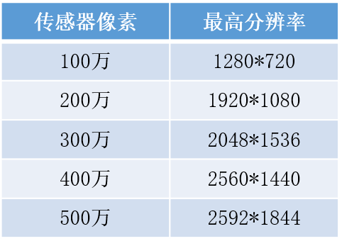 我司IPC有多种传感器像素规格,常见的有100万、130万、200万、300万、400万和500万,对应的分辨率如下表: