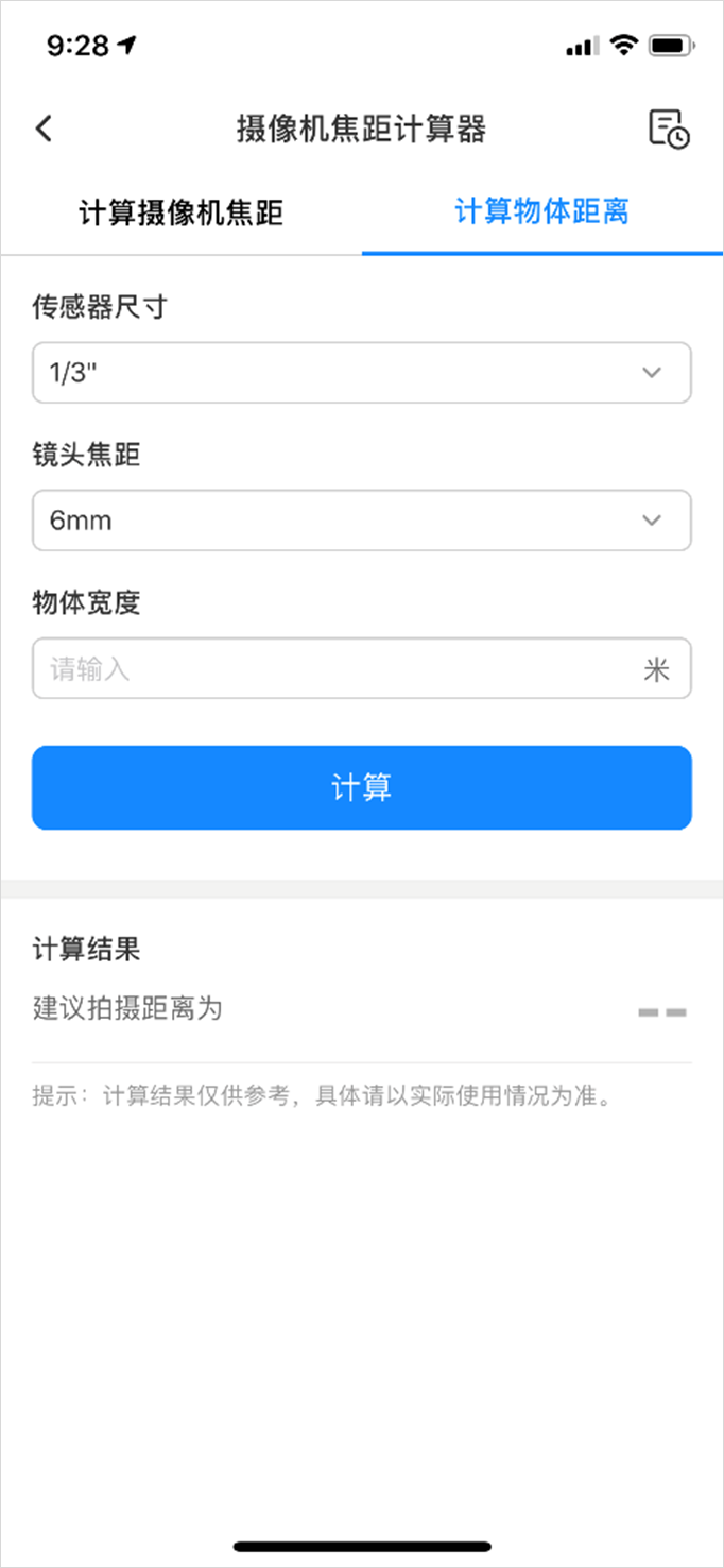 (1) 输入摄像机的传感器尺寸、拍摄距离、监控目标的宽度,即可得出推荐的焦距。