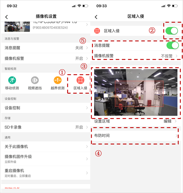 针对支持区域入侵的摄像机,可以通过手机APP、录像机、电脑WEB来控制该功能的设置。