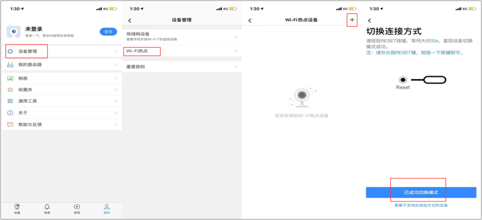 2、切换成热点模式后,仅能通过在APP中点击“退出Wi-Fi热点模式”,退回到之前的模式,无法通过再次短按reset键实现退出;