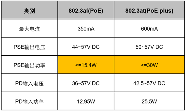 我们知道,完整的PoE系统包括供电端设备(PSE)和受电端设备(PD)两部分,目前标准PoE供电主要有两种标准:IEEE 802.3af和IEEE 802.3at,各自的供电参数如下: