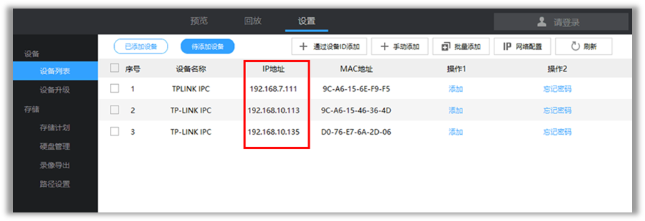 (2)电脑下载并安装TP-LINK安防系统客户端,登录客户端后在“设置”-“设备列表”-“已添加设备/待添加设备”中,可以查看到无线IPC的IP地址。