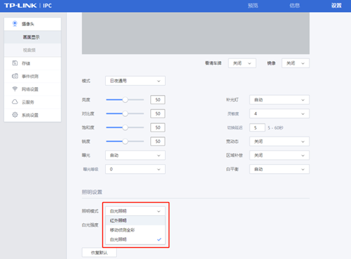 3、默认模式一般为白光照明,觉得刺眼的话可以修改为红外照明,或者根据需求选择智能白光照明。