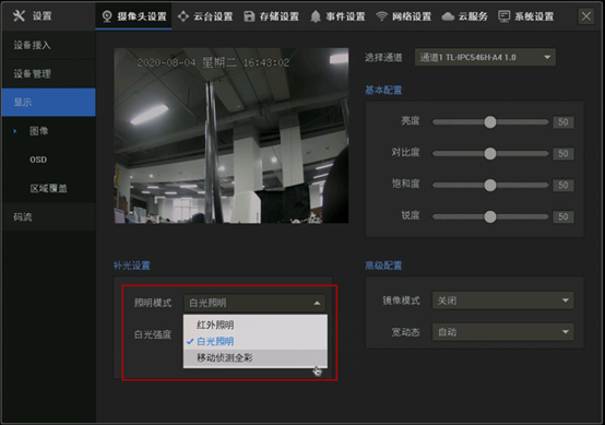 TP-LINK的录像机添加我们的双光源摄像机后,也可以在录像机的GUI界面调节补光模式,进入【设置】-【摄像头设置】-【显示】-【图像】-【补光设置】-【照明模式】,将照明模式改为红外照明或者移动侦测全彩,如下图: