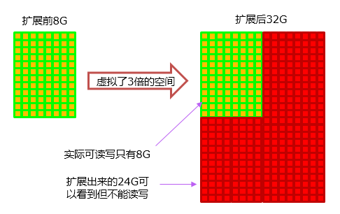 1) 扩容卡:是指用非法手段让容量小的存储卡在电脑、摄像机上显示出的容量变大,比如一张本身只有8GB存储空间的卡,被标注成32GB或以上的卡。被虚拟出的空间实际是无法存储录像的。