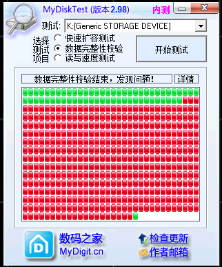 扩容卡和低速卡都可以通过工具测试出来,最常见的工具就是MyDiskTest,测试方法是:在电脑上安装MyDiskTest工具,将SD卡插入读卡器->连接到电脑->打开MyDiskTest工具->选择SD卡->数据完整性校验(读写速率测试)->开始检测。如下就是一张扩容卡的测试结果,红色部分表示数据校验失败,即为扩容出的部分,这部分空间是不可以读写的。