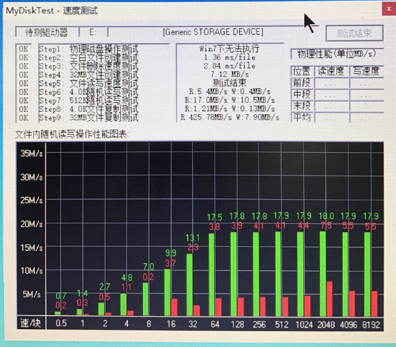 而下面则是一张低速卡的测试结果,图中绿色表示读速率,红色部分表示写速率,可以看到该SD卡的最大写速率只有7.5MB/S,远远低于读速率18.0MB/S,且达不到Class10的标准,使用这类低速卡就有可能出现识别不到SD卡的情况。