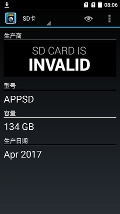 将SD卡放到手机上,安卓手机可以通过一款“洞察SD卡”的APP查询SD卡的生产厂商信息,若是假卡该SD卡的生产厂家信息一般会显示为INVALID,如下图所示。