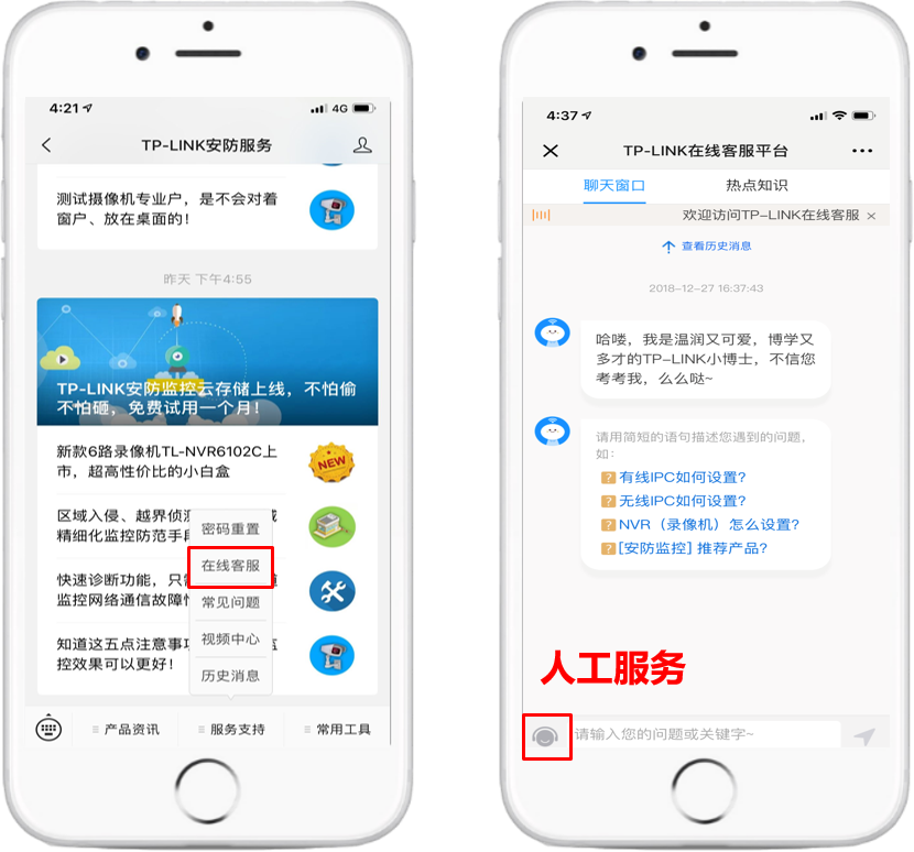 关注微信公众号“TP-LINK安防服务”,点击下方菜单【服务支持 > 在线客服】,再点击人工客服即可。