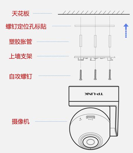 摄像机包装盒内配件会自带:螺钉定位标贴、塑胶胀管、自攻螺钉、吊顶安装支架,这些小的配件需要保管好,按照说明书指引进行安装。另外,需要自备电钻、十字螺丝刀、线扣(如有必要)等工具。
