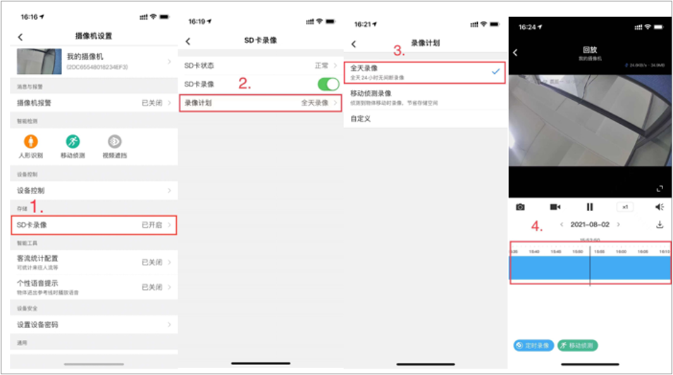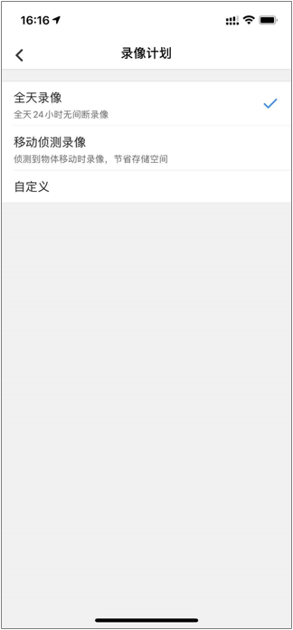 摄像头绑定手机后,可以直接在手机APP或者电脑客户端上修改录像计划,APP具体设置步骤如下图: