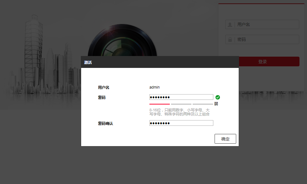 海康IPC出厂为未激活状态,需要激活才能够正常使用。激活IPC,就是给IPC配置一个管理密码。通过电脑浏览器打开海康NVR的WEB界面,即提示设置密码,两次输入密码后点击【确定】即可: