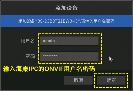输入之前设置好的Onvif用户名和密码,并点击确定: