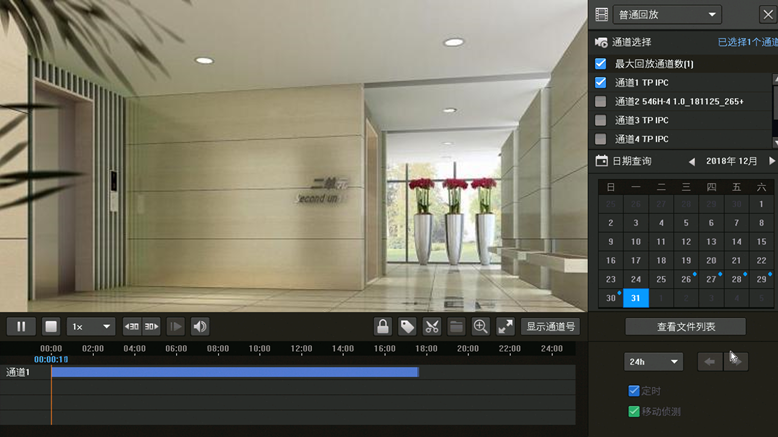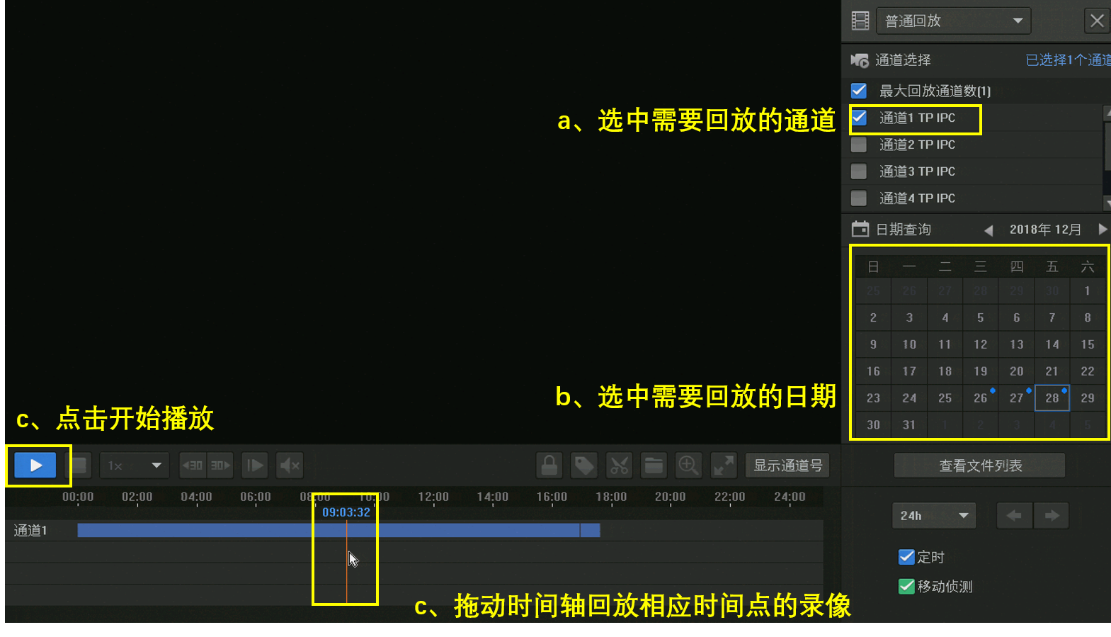 选择要回放的通道,选中需要回放的日期,点击开始播放,并拖动时间轴到想要播放的时间点: