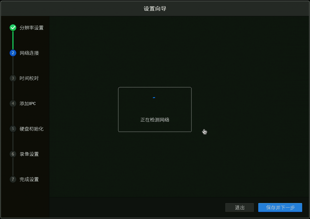 录像机开机后走设置向导,设置好分辨率后,会自动检测上网方式: