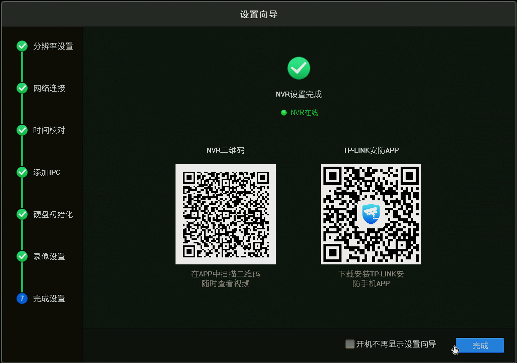 联网成功后,录像机显示“NVR在线”,就可以使用TP-LINK安防APP扫描二维码绑定录像机实现远程监控了。