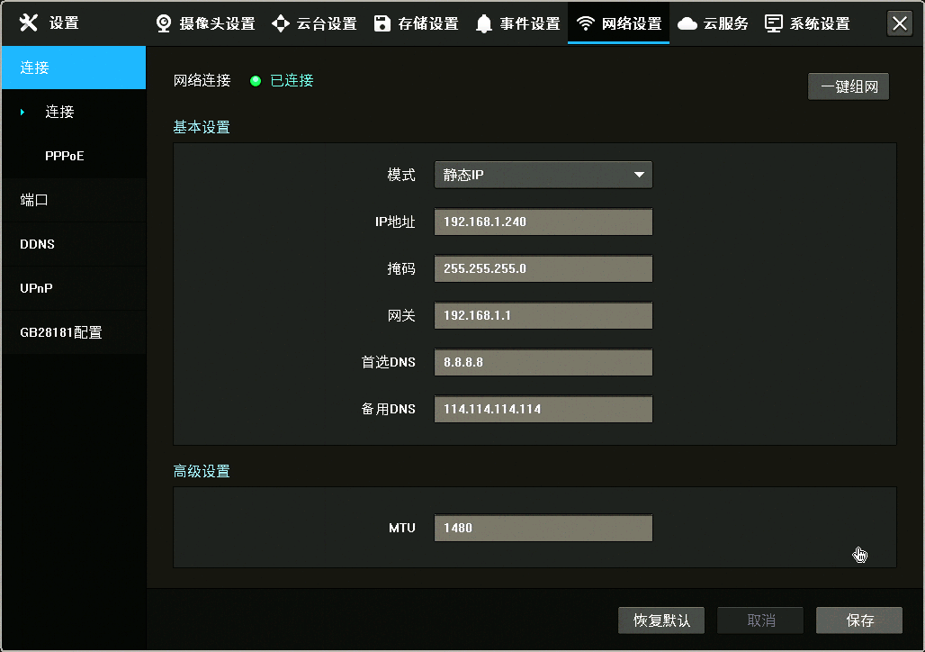 也可以在预览界面右键呼出主菜单,点击【设置>网络设置>连接】,配置录像机的网络参数,包括地址模式、IP地址、网关和DNS等: