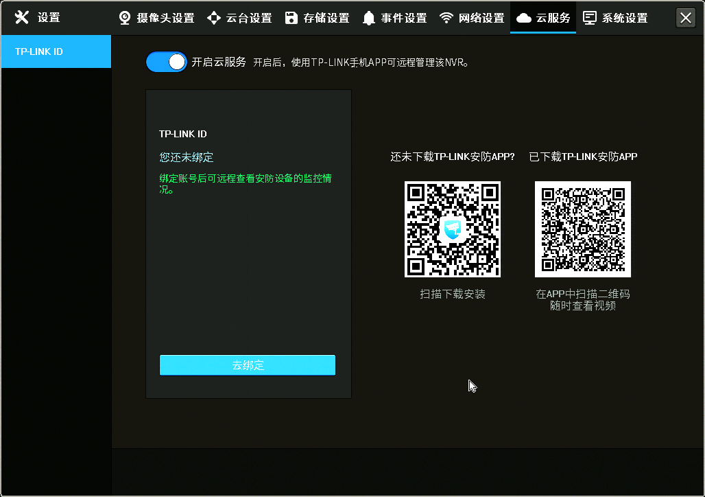 接下来打开【云服务】,就可以点击“去绑定”输入TP-LINK ID账号和密码,或使用TP-LINK安防APP扫描二维码来绑定录像机实现远程监控了。