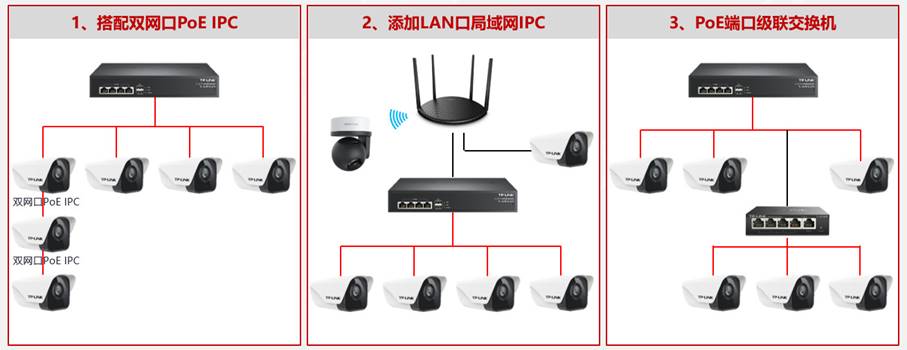 除此之外,我们的PoE录像机应用方法非常灵活,组网异常丰富,单个接口下可以连接PoE交换机扩展接口,也可以连接多台级联摄像机。所有的连接方式下,添加方法都是一样,扫描发现一键添加即可。例如以下方式都可以使用: