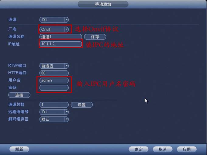 3. 在大华PoE录像机上选择手动添加,选择Onvif协议,输入IP地址、用户名密码等,点击确定。