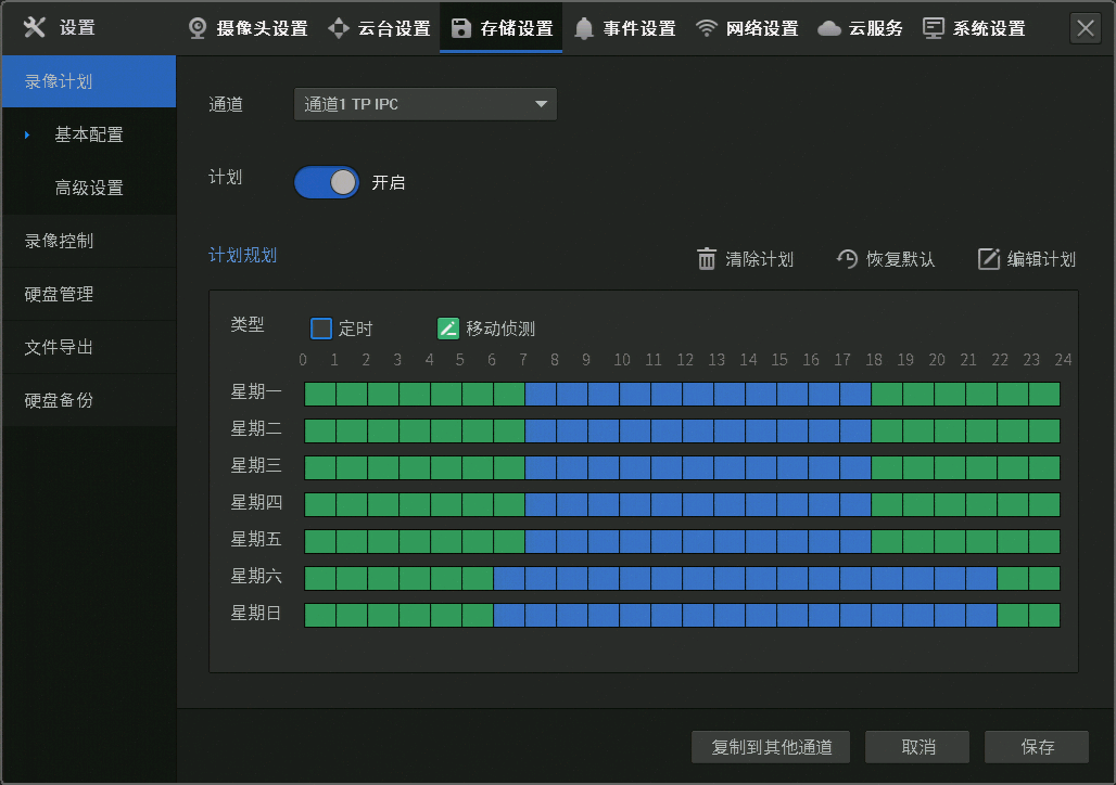 其他通道如果也需要使用同样的录像计划,则可以点击【复制到其他通道】按钮进行复制,如下图: