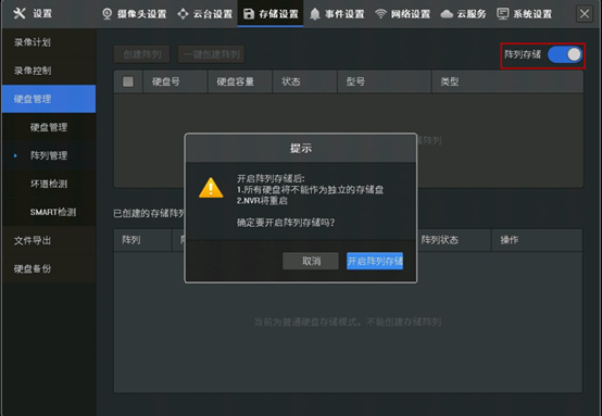 进到【存储设置】-【磁盘管理】-【阵列管理】界面,开启阵列存储;