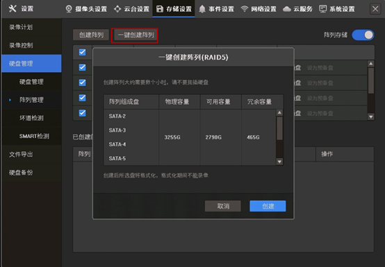 点击“一键创建阵列”,自动创建RAID5,点击“创建”。