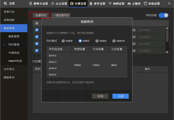点击“创建阵列”,根据所选的硬盘数量创建不同的阵列类型,点击“创建”。