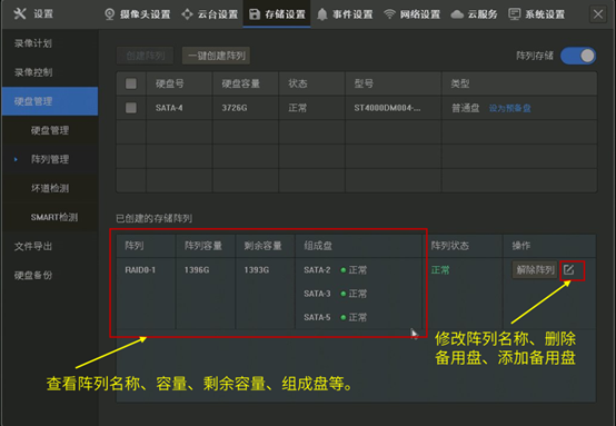 可以查看已创建阵列的名称、容量、剩余容量、组成盘等,点击“编辑”,可以修改阵列名称、删除备用盘、添加备用盘。