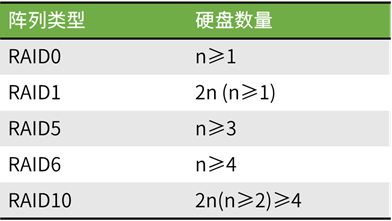 1、一键创建阵列中默认创建的阵列类型是RAID5,手动创建的阵列支持RAID0、RAID1、RAID5、RAID6、RAID10;