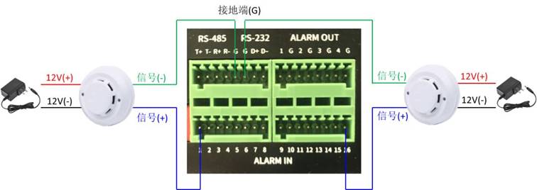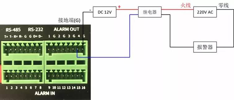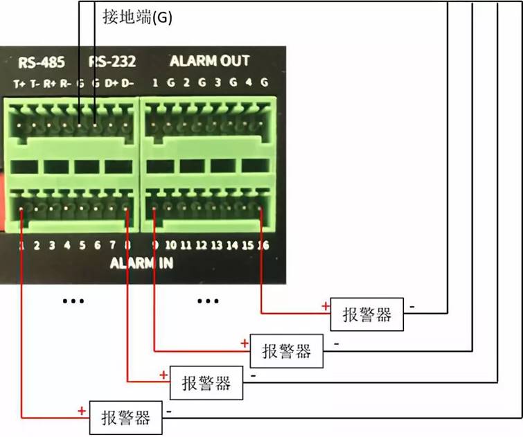 注意:报警输入(ALARM IN)的接地端,需要使用上图示中的G 端,不能连接ALARM OUT接口的G端。