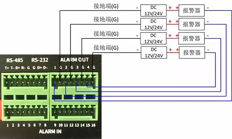 将报警输出设备的正极(+端)接入NVR报警输出端口(ALARM OUT)的正极(标记为1~4);将报警输出设备的负极(-端)接入NVR报警输出端口(ALARM OUT)的相对应接地端(G):