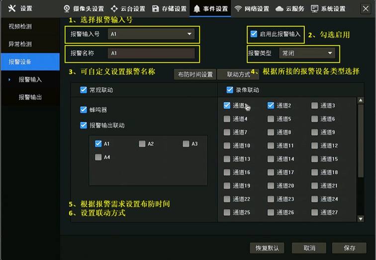 在NVR中可以针对外接的报警设备、摄像机设置对应的响应策略、联动方式,例如电子围栏检测到报警信号后,联动蜂鸣器启动、报警灯响起以及通道1、2的摄像机录像。设置方法如下:
